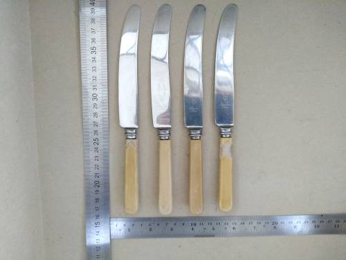 Vintage Set of 4 Handmade Warranted Sheffield England Stainless Steel Ivorine Table Dinner Knives. This matching set of English silverware Knives are all the same size and design. These wonderful knives are probably 1930s / 1940s