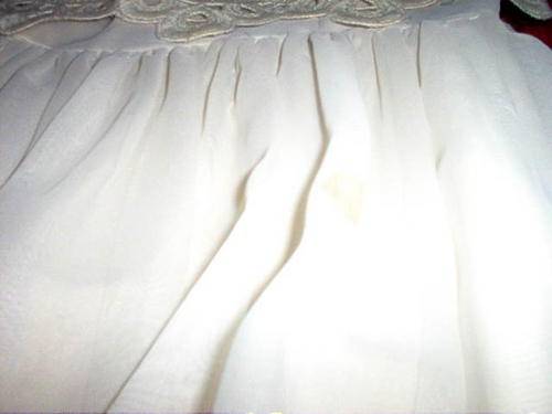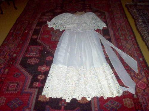 IVORY COLOURED VINTAGE WEDDING OR EVENING DRESS . THE BASE DONE IN A LOVELY LACE FABRIC WITH A SHAWL EFFECT AROUND THE SHOULDERS AND A DELICATE SASH AT THE WAIST. THE WAIST MEASURES 64CM. A SMALL MARK ON THE BODY OF THE DRESS.LABEL READS CREAZIONE MARINELLA REGD.