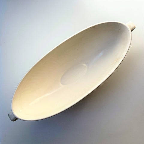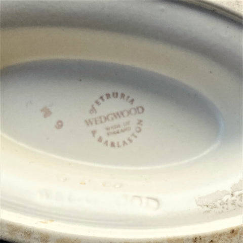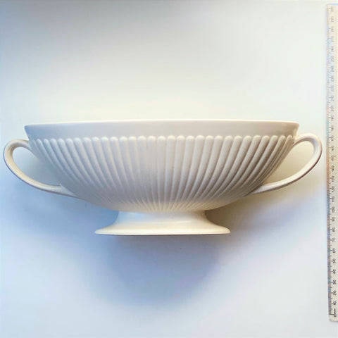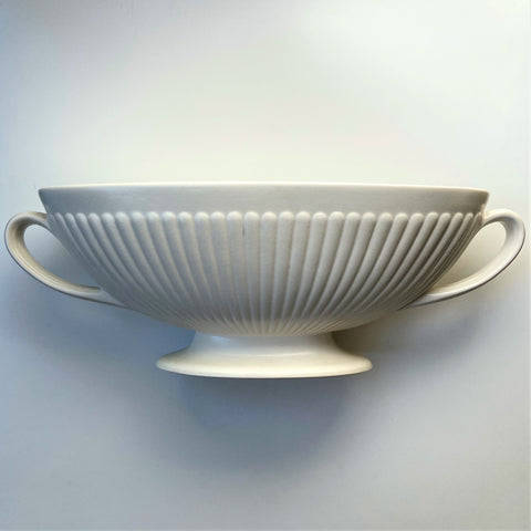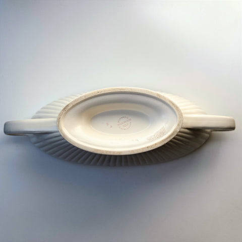 The vintage, oval creamware urn vase is in a classic style with fluted decoration and with two handles. The vase has printed and impressed marks including WEDGWOOD & BARLASTON OF ETRURIA; MADE IN ENGLAND; 6M.