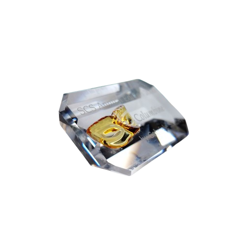 This plaque is made of clear crystal with the yellow mask that the Columbine annual edition holds in her hand on the left hand side. Painted on the plaque is the inscription: