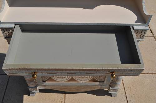 3 shelves on top; 1 shelf inside; 1 shallow drawer.