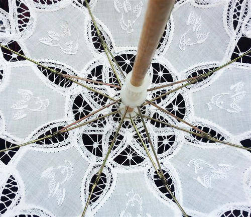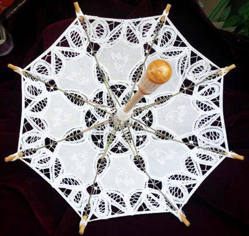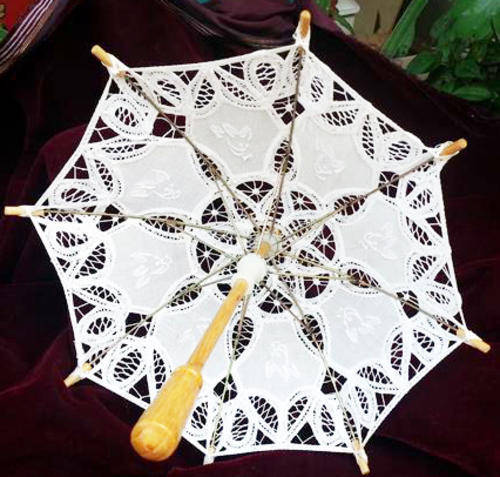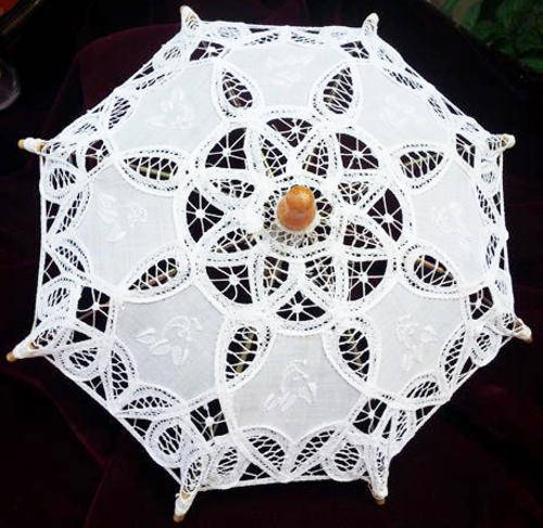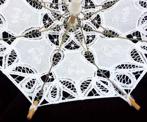 PERFECT FOR DISPLAYING WITH YOUR DOLLS OR TEDDYS, A WHITE VINTAGE BATTENBURG LACE UMBRELLA / PARASOL WITH A TOUCH OF EMBROIDERY AND A WOODEN HANDLE. IN PERFECT VINTAGE CONDITION, NO TEARS, RUST, OR STAINS AND IT OPENS AND CLOSES PERFECTLY !!! LENGTH OF HANDLE 22cm, OPEN DIA MEASURED FROM UNDER THE PARASOL FROM LACE EDGE TO LACE EDGE 27cm.