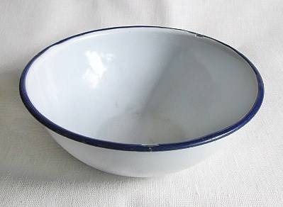 A lovely vintage white enamel bowl with blue rim, some age wear and chips, 5.5 cm high, 15 cm in diameter.