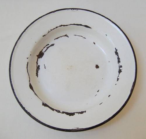 a white enamel with black trim shallow bowl or deep plate.