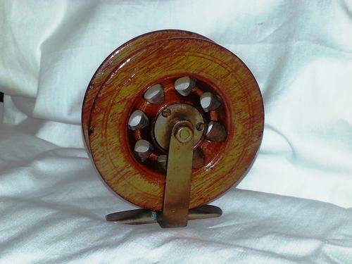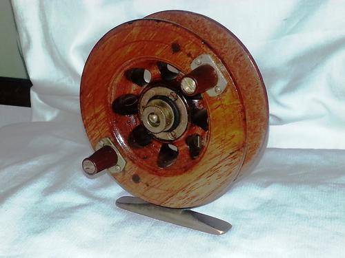 VINTAGE WOOD & BRASS FISHING REEL 11 CM DIAMETER