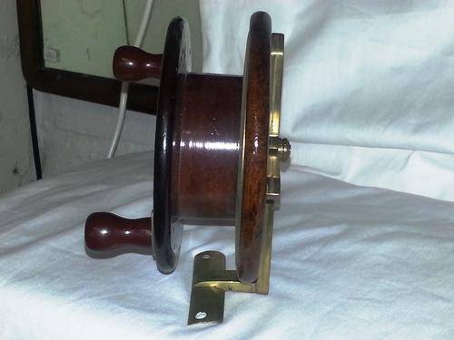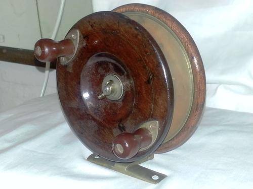 VINTAGE WOOD & BRASS FISHING REEL 13 CM DIAMETER