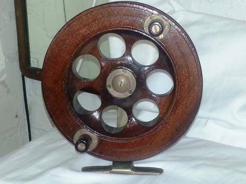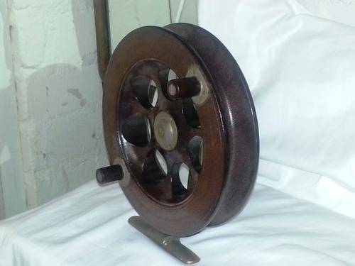 VINTAGE WOOD & BRASS SCARBOROUGH FISHING REEL 29 CM DIAMETER