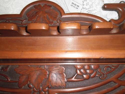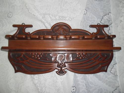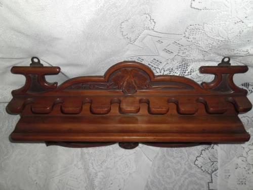 The pipe rack featured is wood and measures approximately 24cm height, 48cm in width and 9cm in depth. The pipe rack holds 8 pipes. Also featured are hanger spots on the back which allows this to be wall mounted. It is in good overall vintage condition and is nice and sturdy. It’s a lovely piece and would be an excellent choice for any pipe collector.