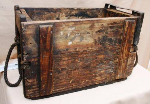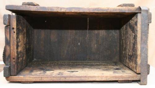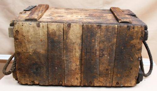 Wooden Ammunition box. No marking on sides, H13 marked in wood on bottom. Rope handle. One side slightly loose. Size: 420 x 240 x 280mm high, 3.530kg. Condition as per picture.