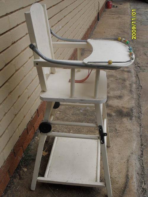 VINTAGE WOODEN BABY FOLD-UP CHAIR. IN GOOD CONDITION,BUT CAN DO WITH A RE-PAINT. FOLDS UP INTO A CHAIR AND TABLE.