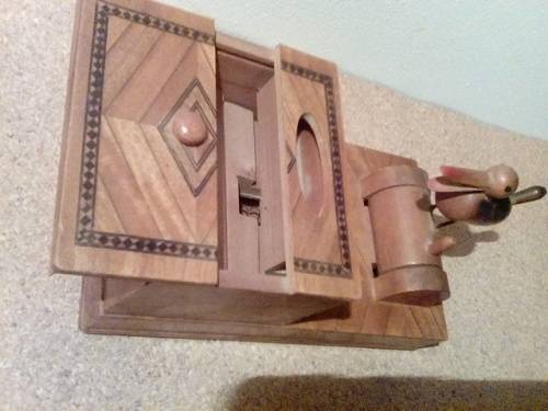 When the small lever next to the bird is moved forward music plays and the bottom drawer opens for the bird to reach a cigarette