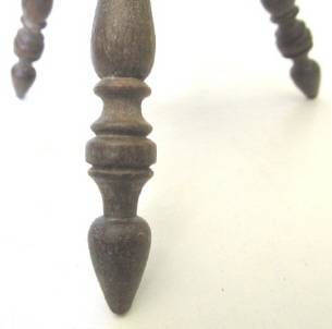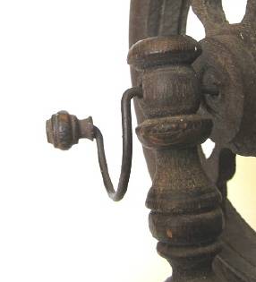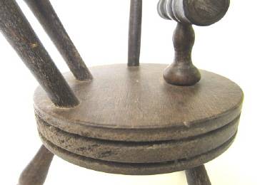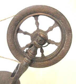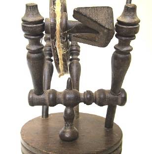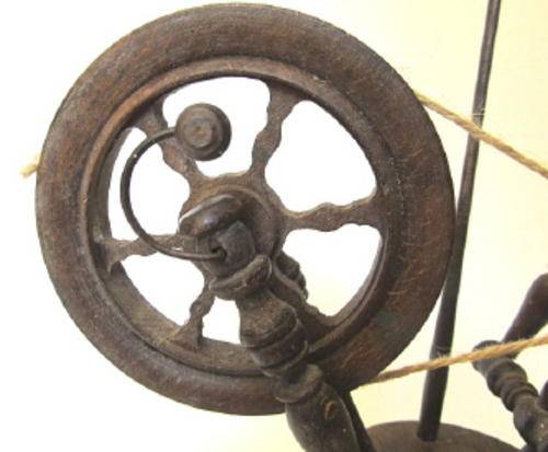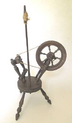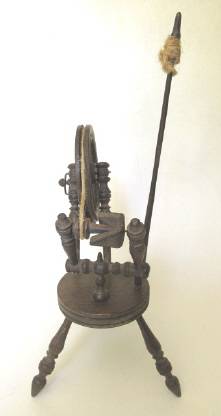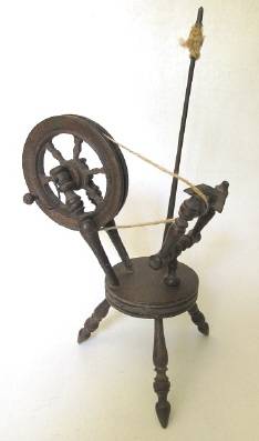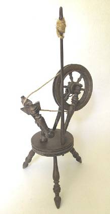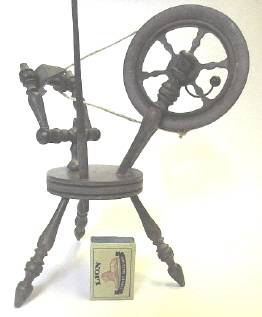 A vintage miniature model of a spinning wheel, with beautifully turned wooden parts. Condition good (though the wood needs oiling). Height (to top of wheel) 250 mm; diameter of wheel 105 mm.
