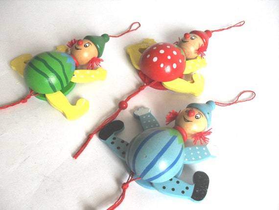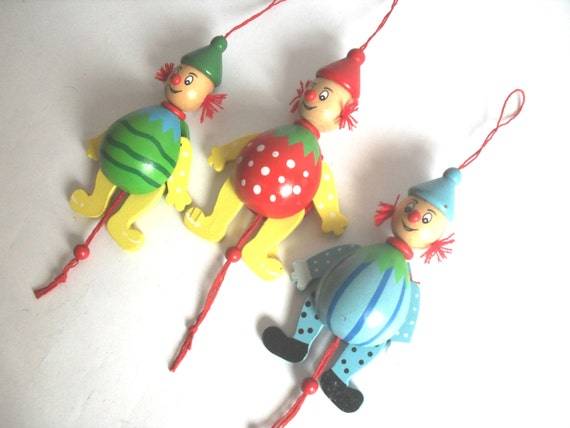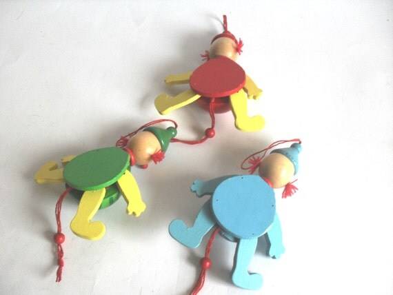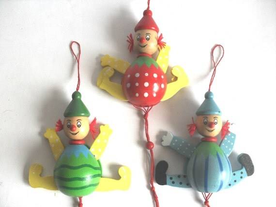 Here is a three wooden dolls of a clowns. They are made circa 60s.