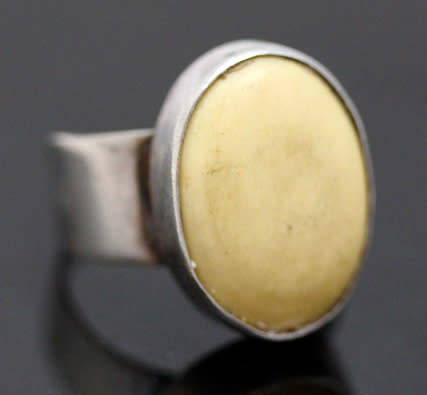 This vintage piece has a simple design - it is solid sterling silver and features a smooth oval Baltic Amber cabochon in an opaque, creamy toffee/lemon, bezel set in sterling silver. Amber comes in many different forms ranging from almost transparent to dense. This piece is very dense, of a fairly consistent colour and hue with few variations. Definitely yellow but with a distinct toffee finish to it! It has not been coated in any way - something jewellers tend to do with modern pieces. They coat the piece in a transparent resin that gives a high shine finish. This one, by contrast, has an interesting more natural sense of age to it. Simple and modern strong lines of simplicity but a vintage ring that defiintely has a story behind it! The shank is a simple sterling silver band,quite broad towards the shoulder (8,5 mm wide) and narrower under the finger for comfort. The ring head measures 12mm long x 7mm across, and is raised quite high in its solid sterling silver bezel frame, 5mm above the finger. The piece weighs a solid 4,82 grams, bears the jeweller's signature, and the 925 hallmark indicating sterling silver. The slightly darker hue of the silver and some buff marks on the silver are in keeping with its age.