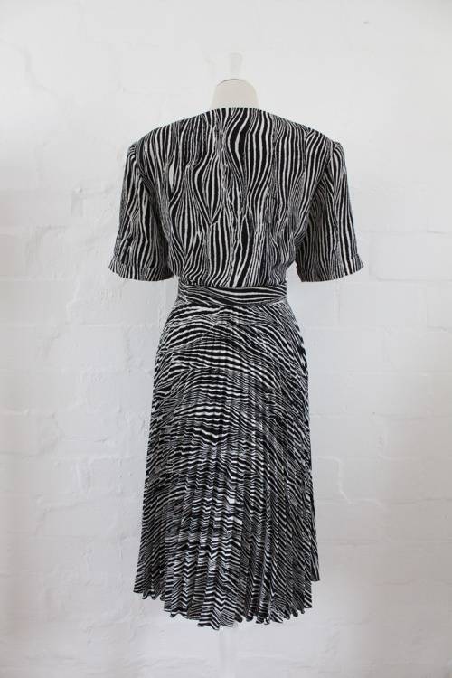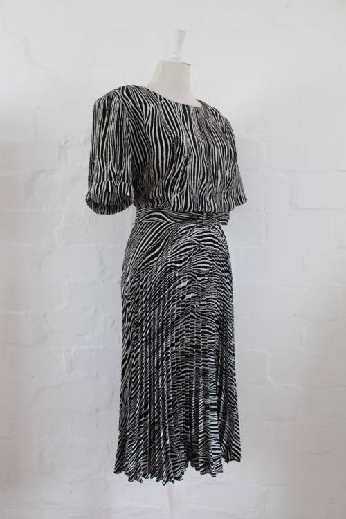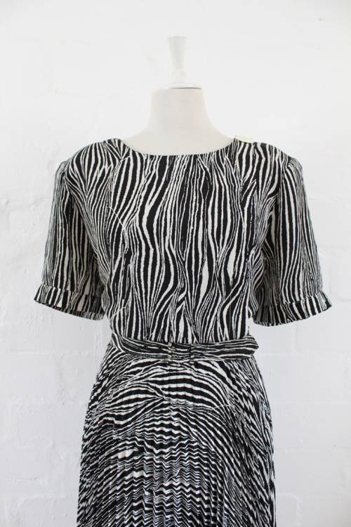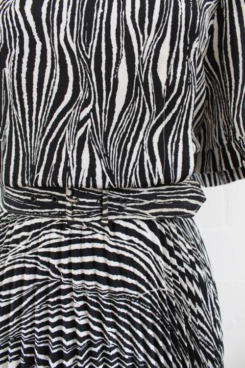 VINTAGE ZEBRA PRINT BLACK WHITE PLEATED BELTED DRESS - SIZE 18