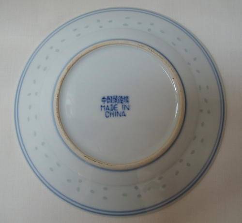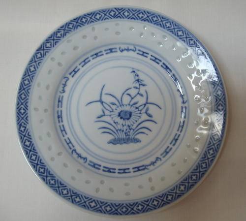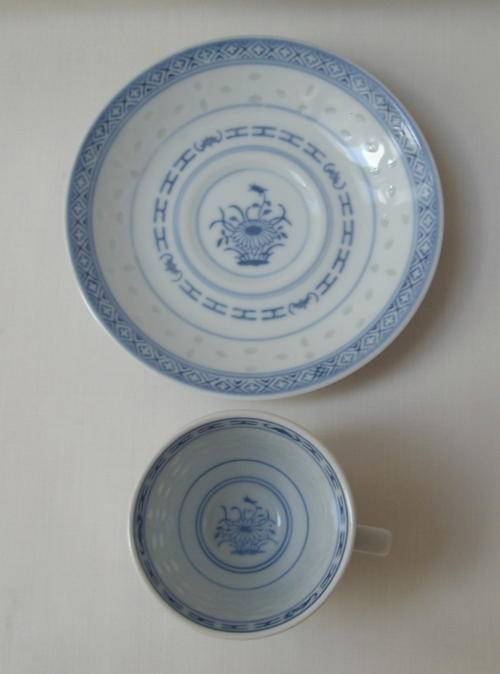 A blue and white translucent rice pattern porcelain coffee cup, saucer and side plate, all