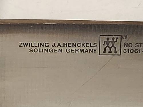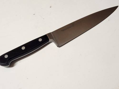 VINTAGE ZWILLING J A HENCKLES SOLINGEN GERMANY CHEF'S KNIFE. IT IS IN A GOOD PRE-OWNED CONDITION WITH MINIMAL AGE RELATED WEAR AND MEASURES 27.5 CM LONG AND 4 CM AT ITS WIDEST POINT.