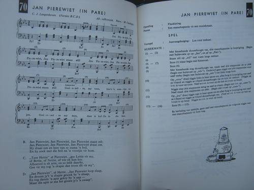 Die Nasionale Raad vir Volksang en Volkspele , 1961. Hardeband. 'n Volkspelehandleiding met 'n aantal nuwe en oorspronklike volkspele, asook reeds gepubliseerde volkspele uit vroeëre amptelike volkspelehandleidings, wat in opdrag van die Nasionale Raad vir Volksang en Volkspele hersien en gestandaardiseer is en bevat die musiek en liriek vir die volgende volksliedere: Aai, aai, die witborskraai - Aanstap rooies - Afrikaners is plesierig - Al die eksamens is nou klaar - Bamboesvlei - Bobbejaan klim die berg - Boemfaderalla - Boereweek - Boetie sy's 'n perskeboom - Bruiloftslied - Daar by die strand - Daar is 'n man - Daar komt die wa - Daar komt tant Alie - Daar oorkant die spruit - Daar oorkant in Transvalia - Die blink vosperd Die hoenders die kraai Die kappietuit Die Kimberleyse trein Die lintse kooi Die Polla van my Die rietjie Die rosie Die vaalhond Die heerlike lente Dis julle wat die wind laat waai Ek soek na my Dina Fyn boerenooientjies Fyn soos 'n vlinder Hier's ek weer Hier's 'n blommetje Hoe ry die boere - Horlosie in die sak - Houtepoppie - Houtjies optel - Jan Pierewiet - Jan Stander - Japie my skapie - "Jou rooilippies, jou suikerbek" - "Kêrels, kêrels" - Kinders moenie in die water mors nie - "Koe-koe, dis hanekraai" - Kollie - Kom ek met die slee - Kom patertje - Kom speel - Lenie Brandt - Liefdesliedjie - Lokkies wou sy dra - Mandolientjie - "Môre Oompie, môre Tannie" - "My hartje, my liefie" - My liewe kokkenennetjie - My vader was 'n trekker - Nikko-Dikkom-Dei - Nooi van die velde - "O, die liewe Martatjie" - Oestyd - Oom Charlie - Oom Jannie - Opsitkers - Ou sukkelaar - Polkadraai - Pollenys - Saam na die noorde - Sarie Marais - Siembamba - Simon het 'n diamant - Stellenbosch - Suikerbossie - Swart Jasper - Swartland - Tant Hessie se wit perd - Taraboemdery - Vaarwel - Vanaand gaan die volkjes koring sny - Vandag kan ons die wêreld wys - Vat jou goed en trek Ferreira - "Vêr in die wêreld, Kittie" - Vrawals - Wie sal staan - . Goeie toestand. 193 bladsye. Bladmusiek met lirieke en dansspel beskrywing vir elk van die 84 liedere. Omslag is verweer en hoeke is gestamp. Geen inskrywings. Die bokant van die hardeblad-rug is gevlek. Verder is dit 'n netjiese eksemplaar. Posgeld na enige plek in SA is R20.