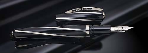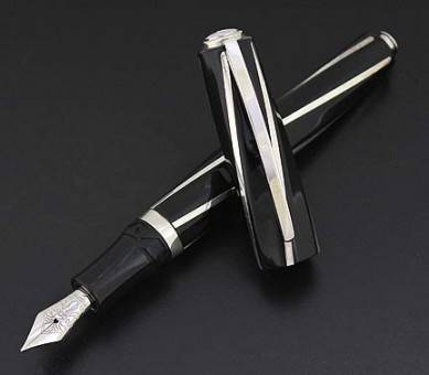 A brand new pen made of vegetal resin and solid sterling silver (Slight oxidation on silver lines visible) with a unique interlocking cap closure mechanism. The filler is also very unique of the push pull type.