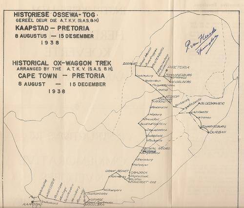 The wagons (2) left Cape Town on 8 August 1938 and travelled along many of the trails taken by the emigrating Boers who left the Cape Colony in 1836. The journey of about 2,500 kilometres took four months to complete.