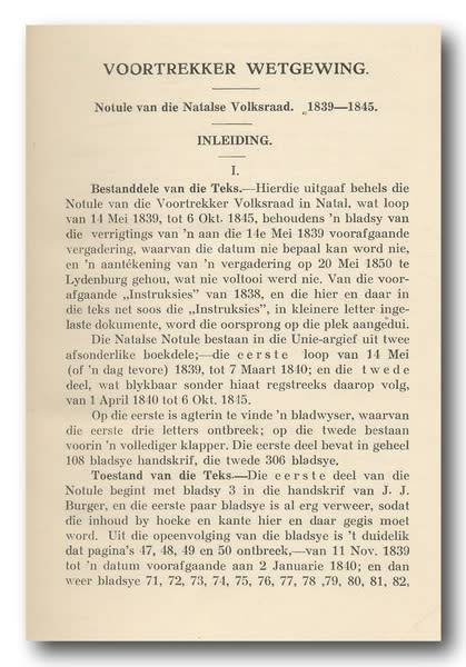 Voortrekker Wetgewing Notule van die Natalse Volksraad 1839-1845 deur Gustav S Preller (1e Druk 1924). A5, hardeband, 296 bls. Boek in algehele goeie toestand.
