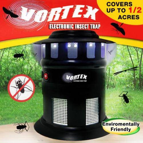 Say Good-Bye to pesky insects – forever with the Vortex Electronic Insect Trap. UV light along with Titanium Dioxide mimics humans scent attracting insects, the powerful vacuum action sucks them into a cage - never to be heard from again. No zapping and popping. It's fast, safe, effective and there's no dangerous or costly chemicals. Covers up to 1/2 acre. Kills flies, mosquitoes, wasps, moths, bees and more. Runs quietly on 4 AA batteries (not included). Perfect for indoors and outdoors. Now you can enjoy the outdoors and picnics without those uninvited guests