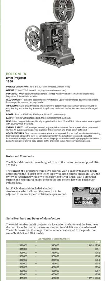 The earliest M-8 projectors were olive colored, with a slightly textured finish, and featured the Paillard over Bolex logo with black control knobs. In 1956, the style was redesigned with a two tone grey and silver finish, with a smoother surface and red control knobs. Most of the late models have the Bolex over Paillard logo.