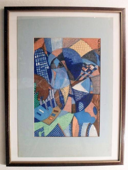 A very unique piece of art! The colors are very vivid and the shapes combine to create a very unique picture! The painting measures 52cm x 35cm and the frame measures 85cm x 64cm. Offered at a very low price act fast and bid now!!