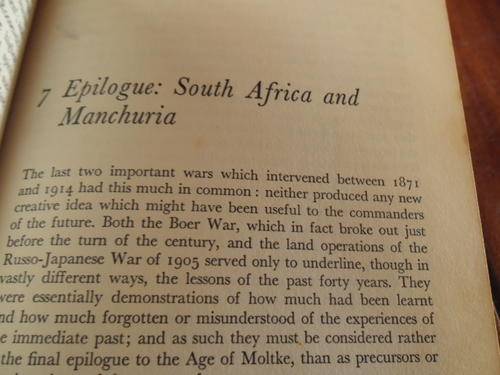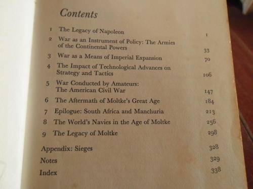 CHAPTER 7: EPILOGUE SOUTH AFRICA AND MANCHURIA 1900 with map of South Africa page 213 - 255 Legacy of Napoleon, War as instrument of policy, armies of continental powers, war as means of imperial expansion, Strategy and Tactics, Americal civil war, Moltke great age,Worlds navies , Age of Moltke, Legacy of Moltke. 4 Map, Bohemian, American civil war, The balkans 1878, Manchuria and the Far East.