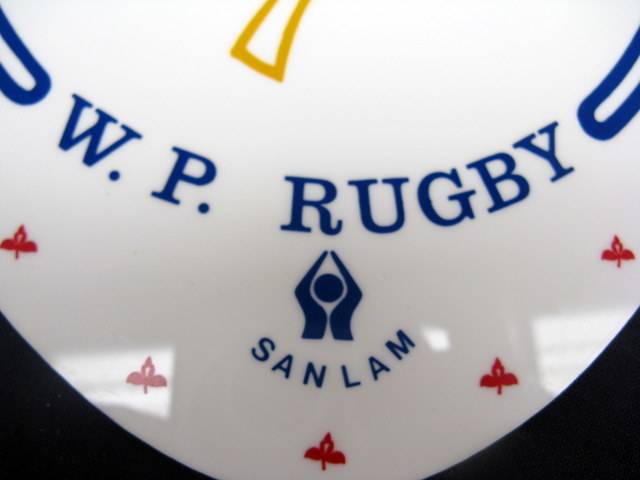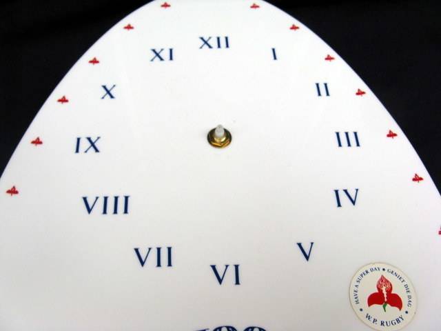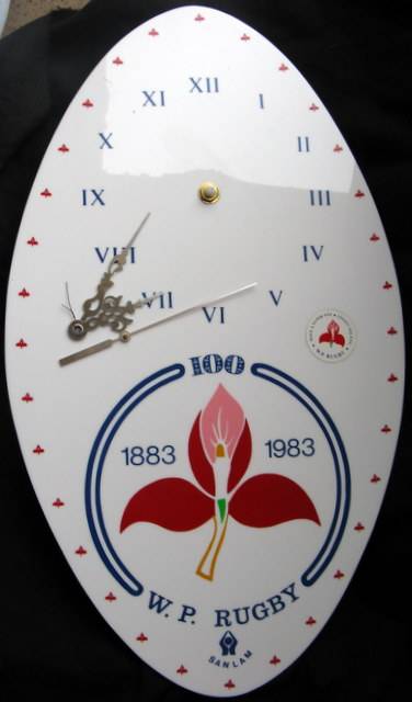 W.P RUGBY - 1883 - 1983 : PERSPEX CLOCK RUGBY BALL SHAPE - 44.5x25.7cm : **WORKING**