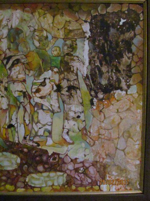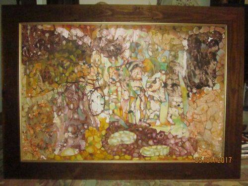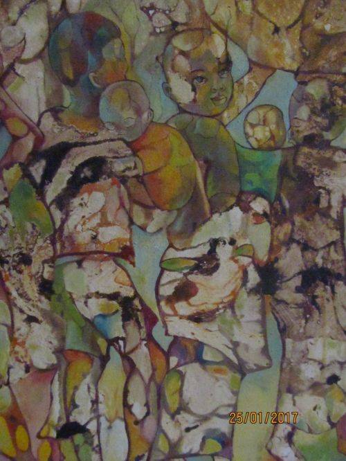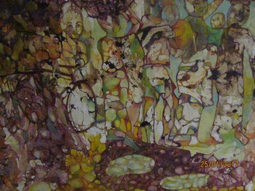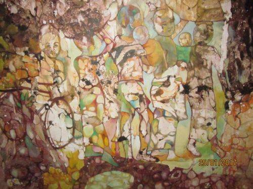 UPON VIEWING THIS LARGE AND CAPTIVATING WORK ONE CAN BE FORGIVEN FOR GETTING SWEPT AWAY BY THE BRILLIANT PATTERNS ON DISPLAY, YET THIS IS MERELY A TECHNIQUE USED BY THIS AMAZING ARTIST TO KEEP THE VIEWER FOCUSED AS HE/SHE THEN BEGINS TO NOTICE THE HIDDEN IMAGES PAINTED INTO THIS MODERN CONTEMPORARY PIECE. AS ONES PERCEPTION HEIGHTENS FACES AND PEOPLE EMERGE FROM THE BACKGROUND INSIDE WHICH THEY HAVE BEEN PORTRAYED AND AS THE SEARCH CONTINUES ACROSS THE PAINTING, ONES APPRECIATION OF THE ART INCREASES RAPIDLY
