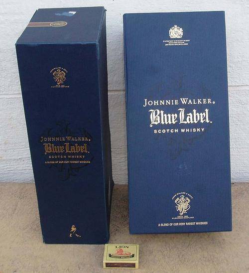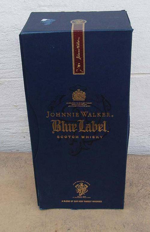 PROBABLY ONE OF THE MOST EXPENSIVE OF THE WHISKY'S ON THE MARKET TODAY.........JOHNNIE WALKER BLUE LABEL.......REGRETTABLY THE BOTTLE IS EMPTY, WELL NOT COMPLETELY.....THERE IS STILL A TASTE OF THE ORIGINAL CONTENTS LEFT IN THE BOTTLE. HOWEVER.....STILL A MARVELOUS DISPLAY ITEM FOR THE DISCERNING PUB COLLECTION. DOUBLE BOX PRESENTATION SET. SILKY LINED INNER BOX CONTAINING ORIGINAL BOTTLE AS WELL AS ORIGINAL JW METAL SEAL. OUTTER COVER BOX FITS OVER THE INNER BOX PERFECTLY. OUTTER BOX SHOWS AN OLD TEAR, NOW GLUED, BUT INNER BOXAND THE BOTTLE IS IN EXCELLENT CONDITION. BOX MEASURES APPROXIMATELY 33 X 10 X 15,5 CM. POST TO ANY SOUTH AFRICAN DESTINATION R36.