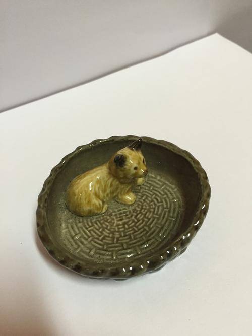 Wade Porcelain Ornament - dog in basket. Approx 7.5cm in diameter.