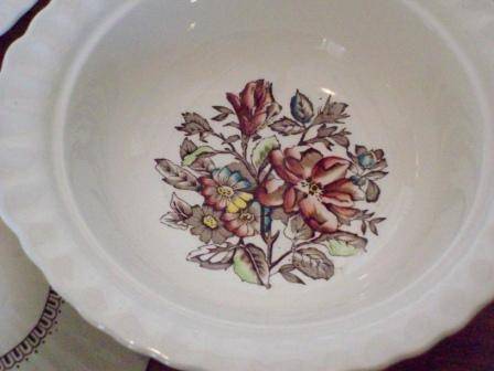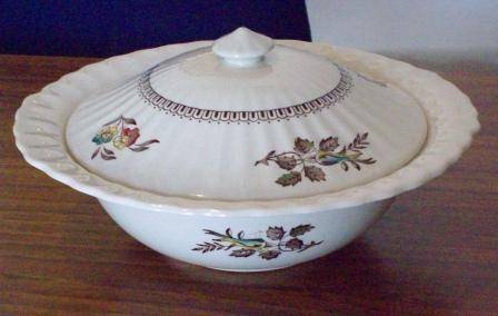 This serving bowl is from the Wade “Hedgerow” collection. The serving section is 5cms deep and 17cms across, in total it is 23cms across. This bowl has a small chip on the side handle and is thus cheaper.
