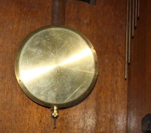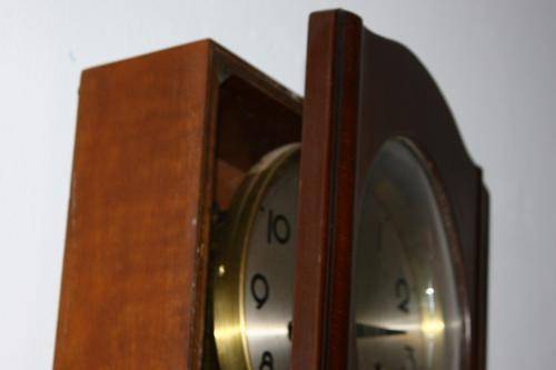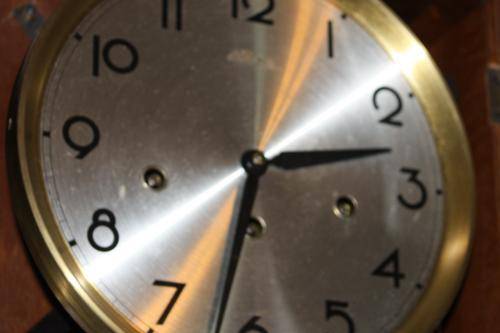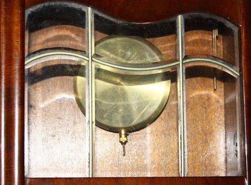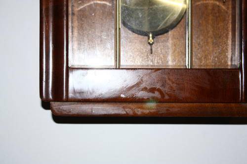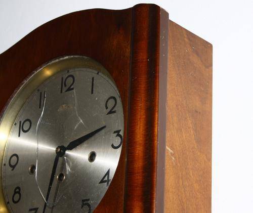 Wall Clock, make has been rubbed but looks like hermle. Not working, I have turned the hands and it does strike every half an hour. No key. note the last two pictures the top of the Glass has cracked. the bottom is lead glazed and is intact. height 55cm, width 31cm. Nice restoration project. CLOCK TO BE BID ON BY HEANOON ONLY