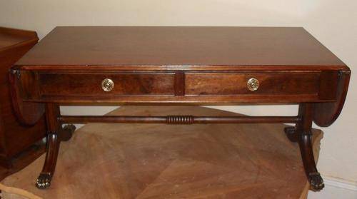 A stunning Walnut sofa table with drop leaf sides and splayed legs joined by a turned stretcher
