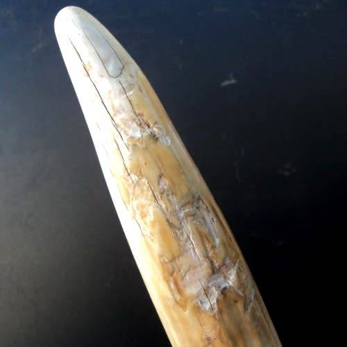 Walruses are found in the Nort Pole and sub - Antartic regions of the The Atlantic and Pacific Oceans. Their tusks are often associated with fighting, but they are, in fact, very important for the survival of the animal since they are also used to propel the animal forward in the ice, to pull the animal out of the water onto the ice, to make breathing holes in the ice when they are under it and to use as an ice pick to, for instance, reach food that is covered in solid ice. Unlike the tusks of, for instance, elephants or warthogs the tusks of the Walrus have only a very small hollow section at the base and are solid ivory for most of their length. A tooth such as this one makes a very nice conversation piece for display in a pub, display case etc. |