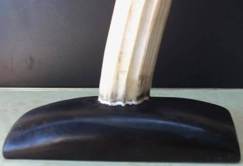 | Description | A prime examplle of a WALRUS IVORY TUSK mounted on an ebony base. To use as paperweight / display ormament / conversation piece & for other uses which I will not mention here. The item is 32 cm tall and weighs about 1.1 kg. If the tusk is measured along the curve it is 31 cm long. The tusk has nice wear on the tip and attractive age patina. There are interesting ribs or grooves along the length of the tusk. Please use the the images below to get a better idea of condition and other particulars of the item. |