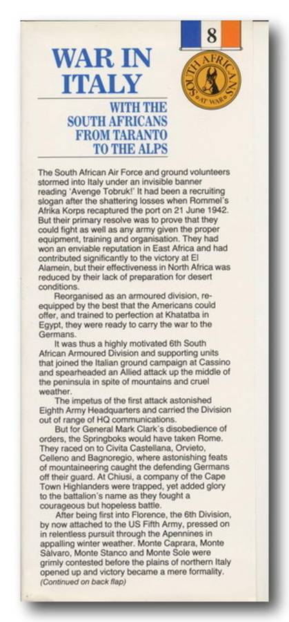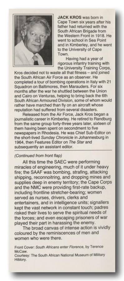 War in Italy with the South Africans from Taranto to the Alps by Jack Kros. 155x240mm, Hard cover with Dust Cover, 318 pages. Book in very good condition.