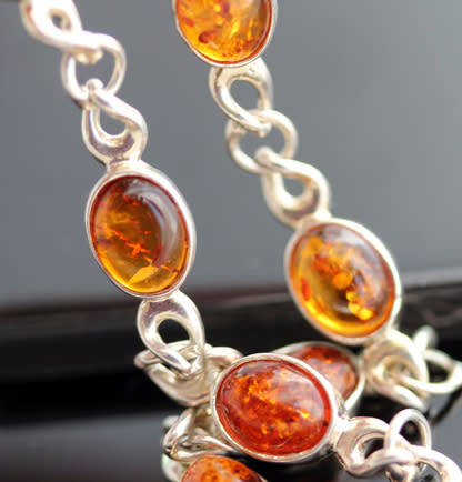This piece has a drama all of its' own. Smoothly polished oval natural Baltic amber cabochons are bezel set in sterling silver, each gemstone linked to the next by 3 large open links, the fastening a simple lobster clip. Baltic amber never fails to fascinate; warm honeyed tones are flecked with both dark and light inclusions, each different to the next, the colour positively glowing next to the sharp white sparkle of the silver. The gemstones are bezel set with openwork underneath allowing light to pass through and magnify each inclusion. The bracelet measures 20,5cm long and 7mm wide and weighs 9,26 grams. It bears the 925 hallmark indicating sterling silver. It is a vintage piece but not seriously old. At 9,26 grams, I would not describe the bracelet as dainty. It is strong and solid - the thick silver links are themselves a design feature - and weighty but not a hefty piece.