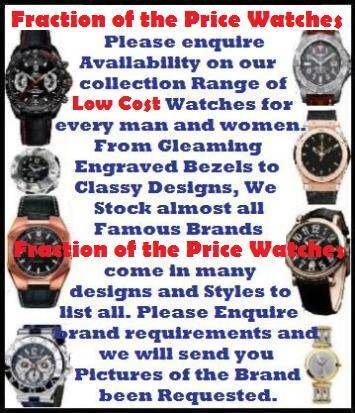 We stock a Large Collection of Low Cost Famous Branded Watches at a fraction of the price for both men and Women. Too many Designs and Styles to list all. Please enquire BRAND and we will inform you of availability and provide pictures if possible. Note you bidding on One watch on a Randomly Selected Style & Brand on Availability ONLY