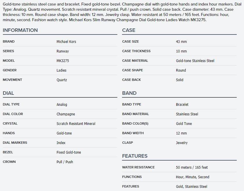 WATCHES - MICHAEL KORS SLIM RUNWAY CHAMPAGNE DIAL LADIES WATCH (MK3275)