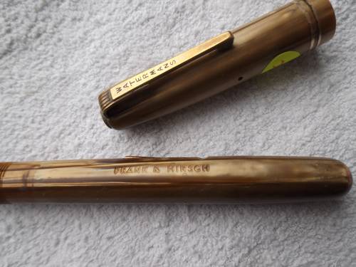 Waterman Gold Marble Lever Fountain Pen.14ct 2A. Frank & Hirsch is stamped on the pen. The nib is bent forward a little, not sure if it should be that way as the nib does look in good condition. Needs a nice polish. Post Office with tracking number R60 or Post Net R120.