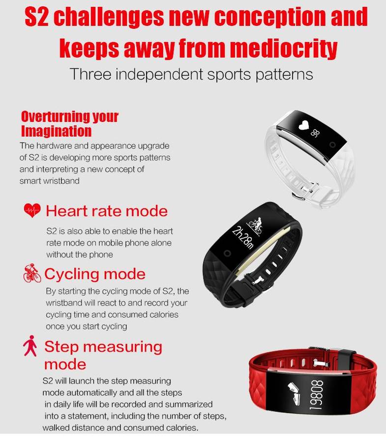 IP67 waterproof. S2 can be weared to swim. (depth not over 1m, time not over 30mins) Sports and Health: sports tracking (Pedometer, distance,calorie) sleep tracking (sleeping time, sleeping quality) set fitness goals movement pattern (Swimming mode, Bicycle-riding mode, Runningmode, Ropeskipping, Sit-ups, Jumping jacks). GPS movement Trajectory, distance, Time, Pace, Calorie, Historical records, track sharing. Real-time dynamic heart rate monitoring. Alert & Notification function: call reminder (Android, iOS), contact name display; Facebook, Twitter, Line, SKYPE, WhatsApp (Android, iOS), content display; Sedentary; Anti-lost warning; Clock alarm; Task alert. Smart buttons Find phone: Camera remote, Music remote, Video remote. Wake up screen by turn wrist Built-in 90mah Lithium-ion polymer rechargeable battery,can be used about 10 days. Compatible with Android 4.3 and above, IOS 7.0 and above, with Bluetooth 4.0 Phone. APK Name: SmartWristBand. APK Language: Simplified Chinese, traditional Chinese, English, multi language.