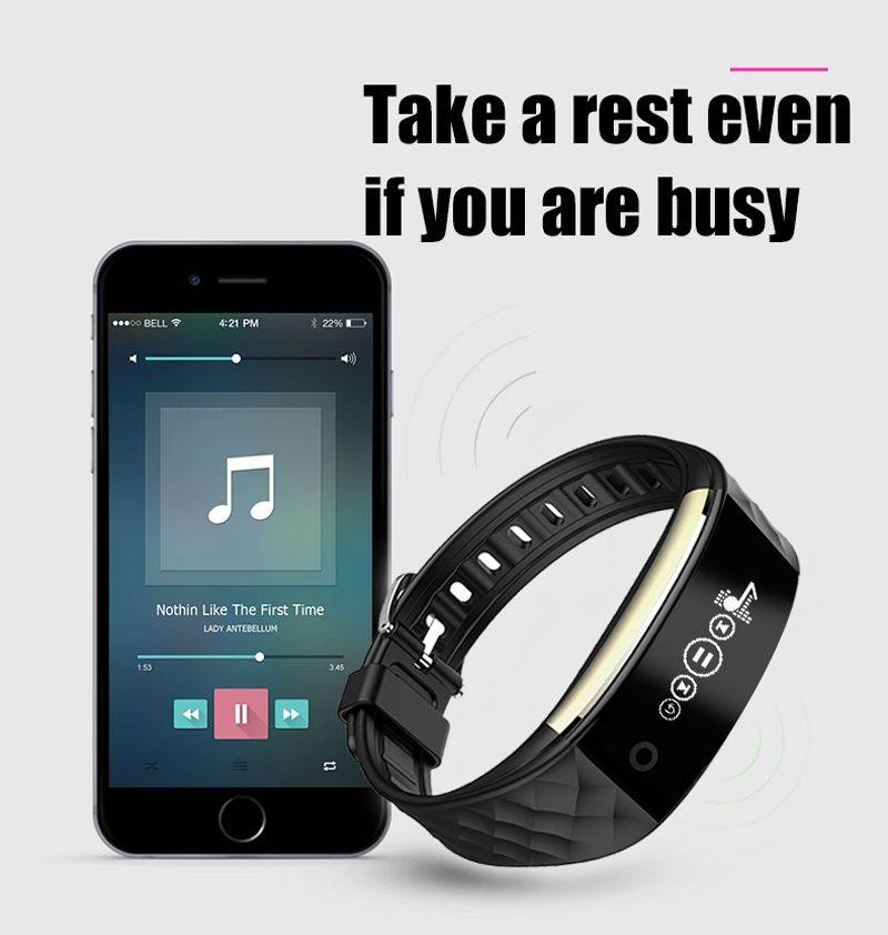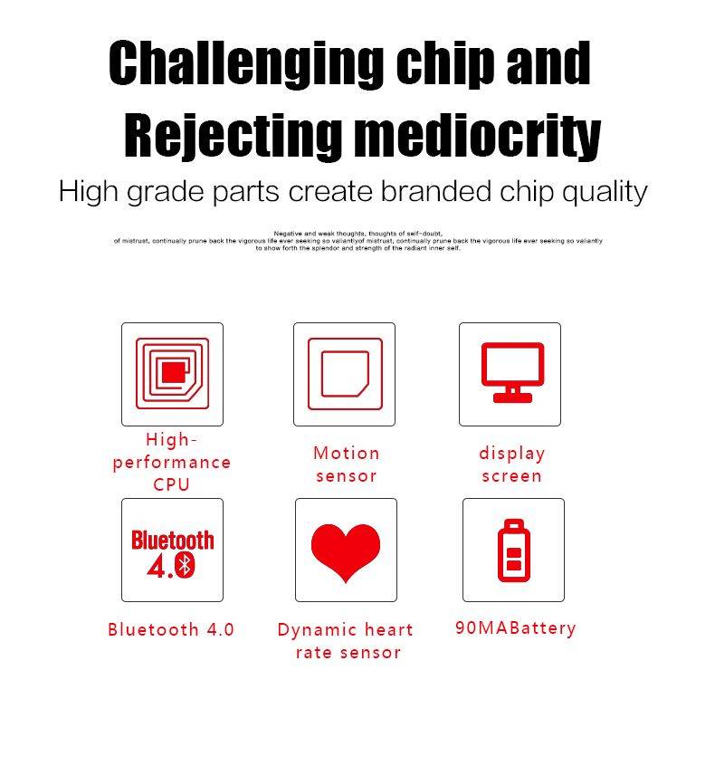 Specifications: CPU: BT V4.0 BLE Display: 0.96 inch, 64*128 Acceleration: 3-axis G-sensor Heart rate: Dynamic heart rate detection Battery: 90ma Lithium-ion polymer rechargeable battery Motor: Built-in,remind with vibration Font: Full character display Charge: 5V USB jack,charge by PC USB Water-proof level: IP67,Swimming (depth not over 1m, time not over 30mins) Data Sync: data synchronization to mobile app Data storage: Storage 7 days' sports data Compatibility: Support IOS 7.0 and above, Android 4.3 and above