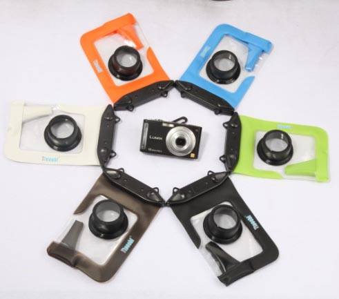 This item is made of high quality PVC plastic; available size is: 14 x 10.5cm; fit any camera under this size.