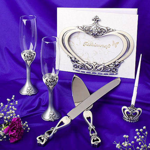 A Royal Wedding is yours with our Royal Wedding Collection of crown design wedding day accessories. Your wedding day is surely a day when you want to feel like royalty. Complete with all the trimmings you’ll need for your reception, the set includes two 9” x 2” toasting flutes , a 12” x 1” cake knife and 10” x 2” server set, a 9 ¾” x 7 ¾” guest book , and a 7 ¾” x 1 ¾” pen set. Sure to be a memory-filled keepsake set that you will treasure forever and one that can be passed on as a regal new family tradition, each piece is exquisitely crafted with pewter-colored poly resin in a detailed/carved crown design and comes packaged in an olive and cream damask design display box with a clear top – great for safe storage after your big day is through. (Set includes a flute set, a cake knife set, a guest book and a pen set).