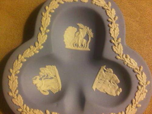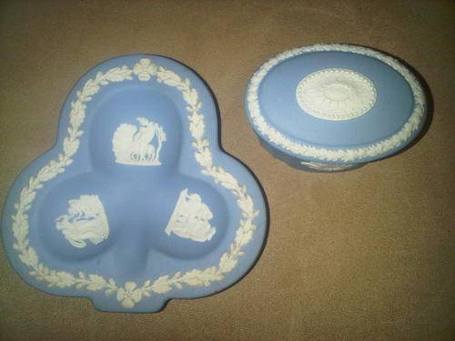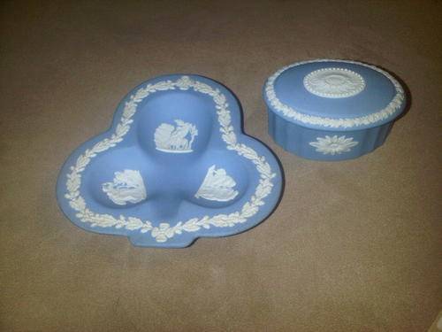This set of 2 items is a ring and earing dish and a bangle dish. Wedgewood is a quality type of pottery. The process of wedgewood is not an easy one as the main item is created but the white is added on layer by layer building up the picture and features all the way to the tiny details. The measurements are : 3.5cm x 6.8cm x 5.5cm and 11.3cm x 11.5cm x 1.6cm.