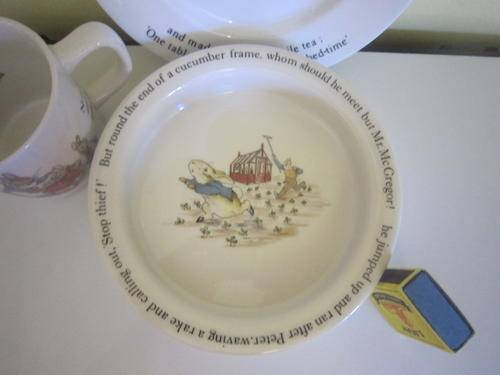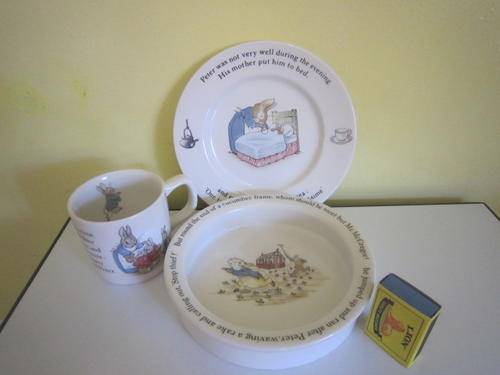 This is a trio of Wedgewood " Peter the Rabbit " childrens crockery that I have split into 3 different lots in case only 1 is wanted by a buyer, this 1 is for the porridge bowl. It is in immaculate clean condition as are the other 2 items. Makers mark on the back of the item reads Wedgewood of Etruria & Barlaston, copyright Fredrick Warner & Co, Beatrix Potter Designs, Peter Rabbit. The quality of this porcelain is superb and will make a lovely present or can be added to your collection. 17cms long and 3.5cms high, postage 65.00.