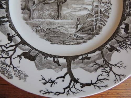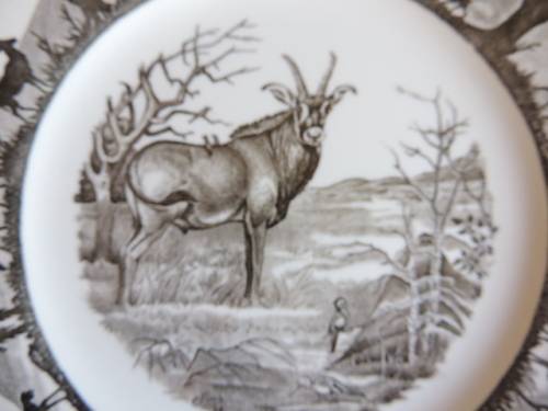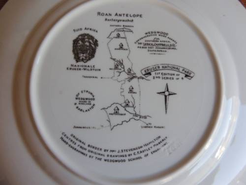 This rack plate, 27 cm in diameter is highly collectable and in good condition. The wide border is a typical South African bushveld scene and the centre piece is the Roan Antelope. It is signed and dated 1949 and the impression on the back is for 1951.This is the 1st edition of 2nd series of 4.